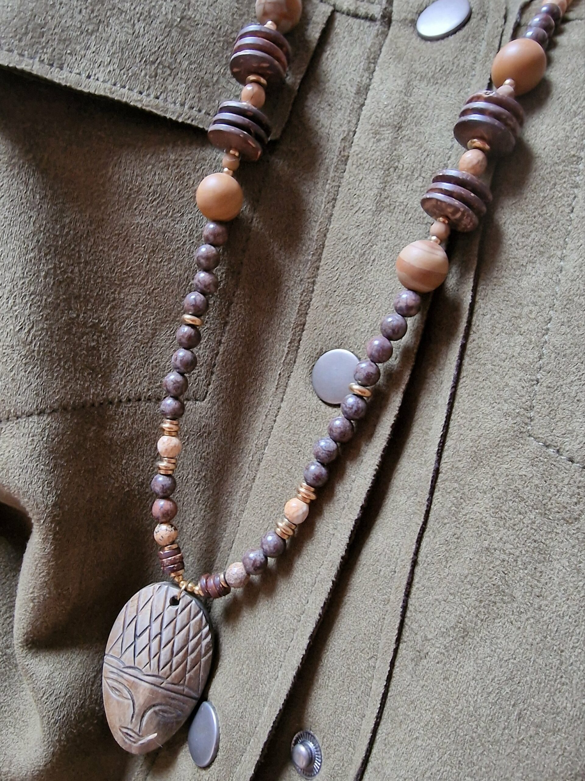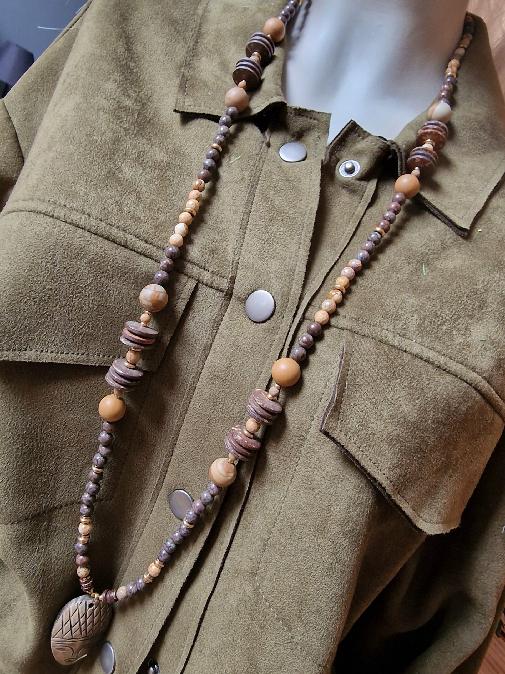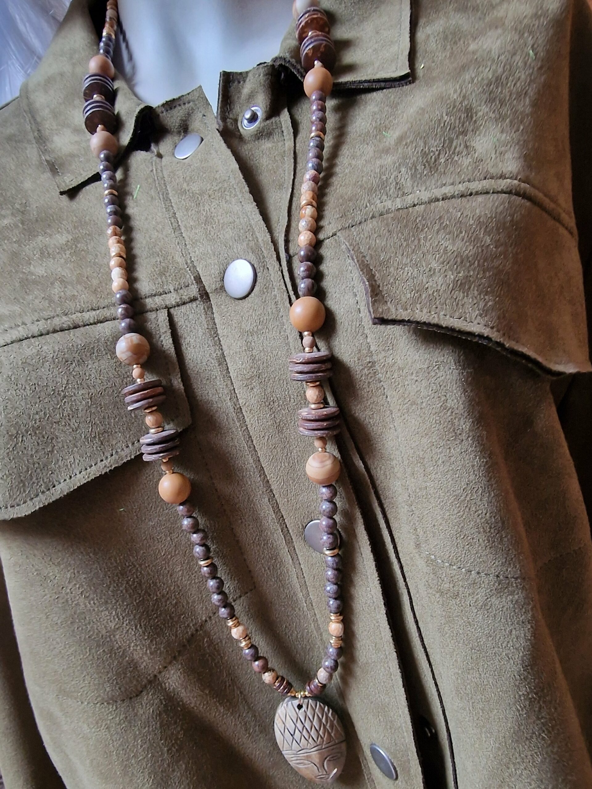 Portez ce sautoir pour ajouter une touche de nature à votre tenue quotidienne. Les pierres naturelles et la noix de coco créent une connexion avec la terre, tandis que les hématites plaqué or ajoutent une élégance sophistiquée. La figurine apporte une note artistique, ajoutant une dimension ludique à cette pièce distinctive.